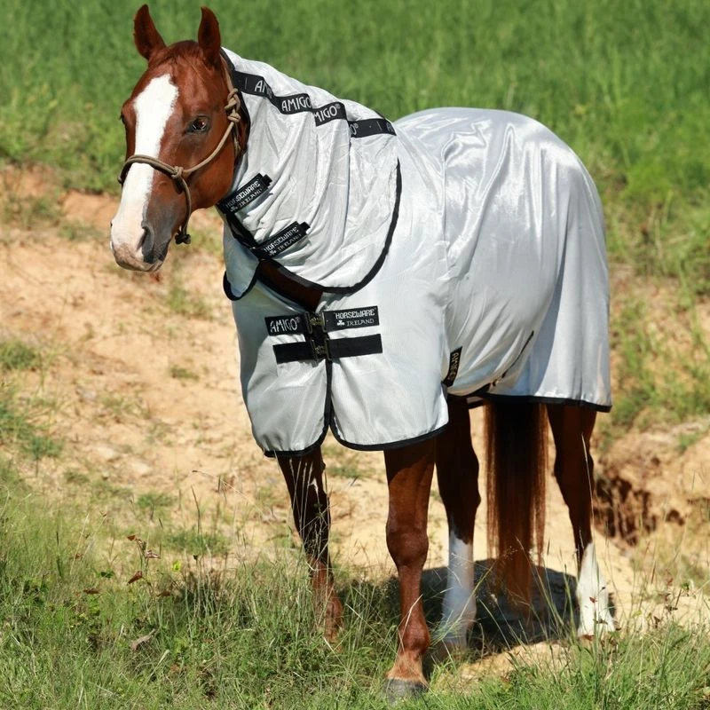 The soft, breathable, lightweight mesh knitted fabric in a sun-reflective silver drapes over your horse’s curves for a comfortable and snug fit. Design features your horse will love include an extra-large tail flap for fly protection, our classic front closure and front leg arches offering freedom of movement, a silky shoulder lining for comfort, double cross-surcingles, a removable neck cover and D-rings. By unique design, Horseware® sheets and blankets do not need leg straps to stay secure and in place. However, this sheet allows you to add them should you wish*.