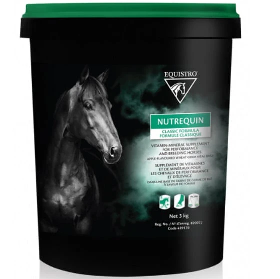 Nutrequin® Classic Formula contains selenium (Reg. #950120), vitamin A, vitamin D3 (Reg. #990765), dl-alpha tocopheryl acetate (Reg. #990014), menadione sodium bisulfite, vitamin B12, thiamine mononitrate, riboflavin, calcium pantothenate, niacin, folic acid, pyridoxine hydrochloride, choline chloride, monocalcium phosphate, sodium chloride, magnesium oxide, zinc oxide, manganous oxide, copper sulphate, ground limestone, potassium chloride, calcium iodate, ferrous carbonate, cobalt carbonate, wheat-germ meal, dried alfalfa meal, mineral oil, flavouring agent (Reg.#880154), sweet molasses (Reg. #980351).