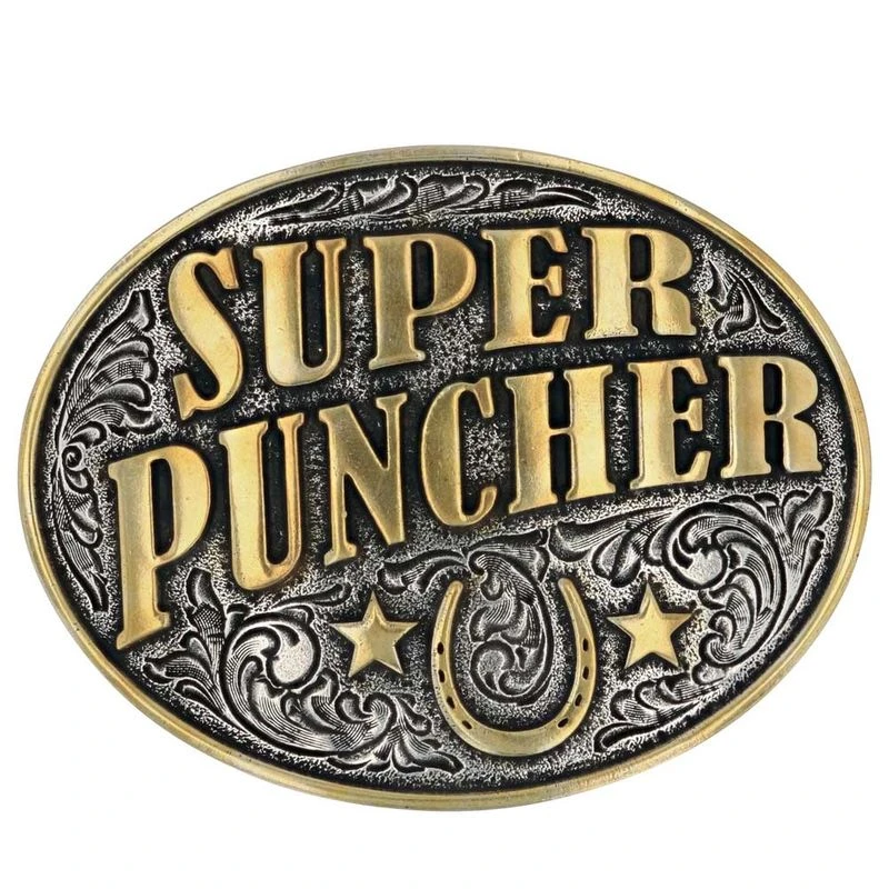 Name two words that are Dale Brisby’s favorite? Easy: “Super Puncher!” This Dale Brisby Collection Belt Buckle is silver-toned with phenomenal faint filigree etching. It holds the words “Super Puncher” in the center in a gold-tone. This buckle has a standard 1.5 inch belt swivel and a smooth gold-tone trim.